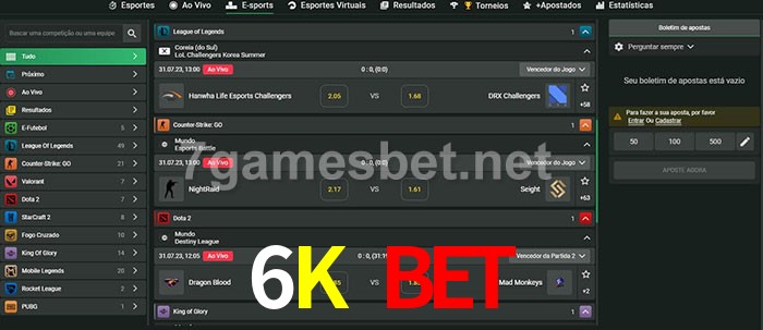 O 6K Bet oferece uma grande seleção de opções de apostas em e-sports com probabilidades competitivas